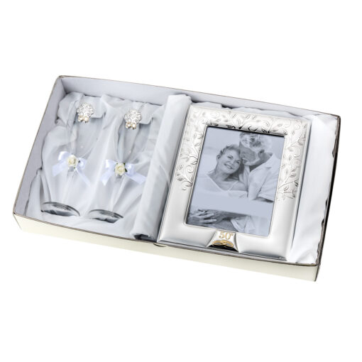 Pahare Sampanie Aniversare Nunta de Aur + Rama Foto Argint
