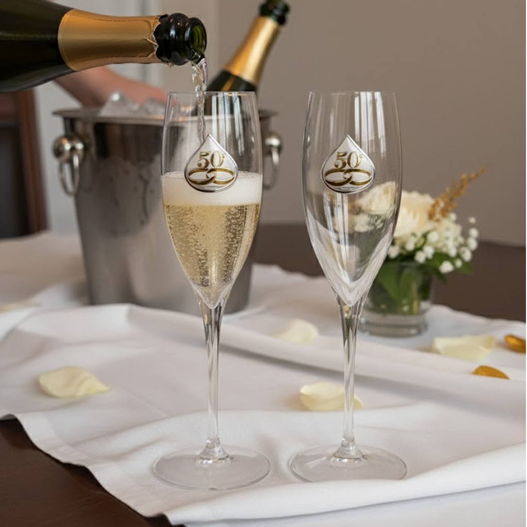 Cele doua pahare de sampanie sunt cadoul ideal pentru a sarbatori Nunta de Aur, un moment special care marcheaza 50 de ani de iubire, respect si armonie.