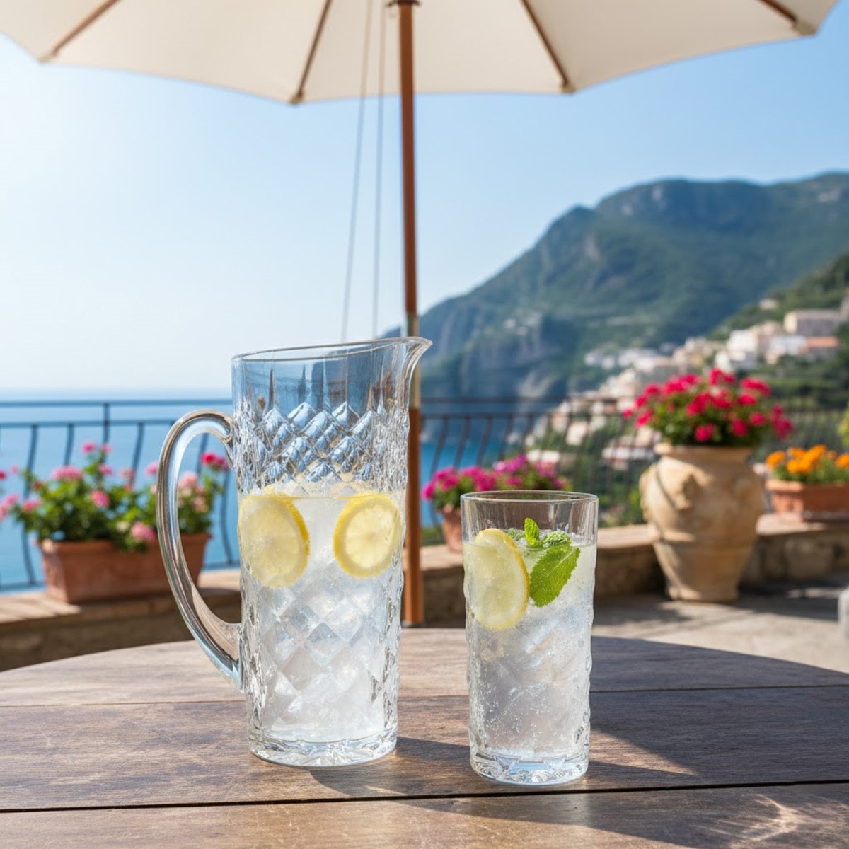 Carafa spatioasa de 1150 ml este ideala pentru a pregati si servi apa cu lamaie, vin, limonada proaspata sau ceai rece, pastrand bautura proaspata pe parcursul mesei. Cele 6 pahare de 330 ml au dimensiunea perfecta pentru o portie optima de hidratare, fiind usor de manevrat si versatile pentru orice tip de bautura racoritoare.