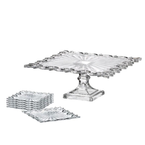 Setul include un platou cu picior, generos dimensionat la 32 cm, ideal pentru a prezenta torturi spectaculoase, prajituri sau alte deserturi.